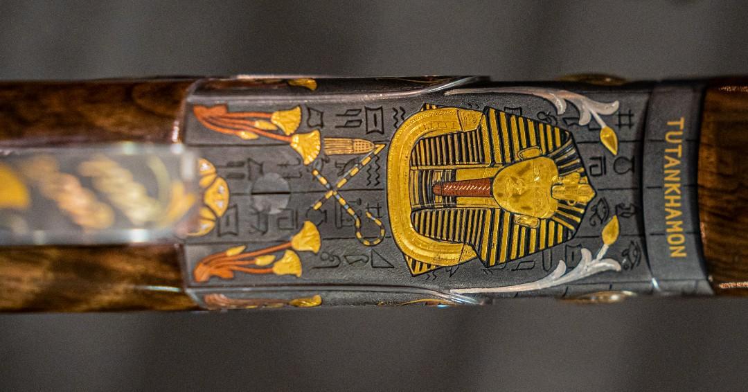 Dubbed the Tutankhamon for obvious reasons, the shotgun is based on one of the company’s SL3 12-gauge over-and-under in a classic field configuration complete with Steelium hyper-polished 30-inch Optimabore-HP barrels. Going far past basic, the shotgun is an EELL grade, the company’s highest in terms of engraving and woods, and has more than 1,000 hours of inlays by Italian master engraver Luca Casari.
